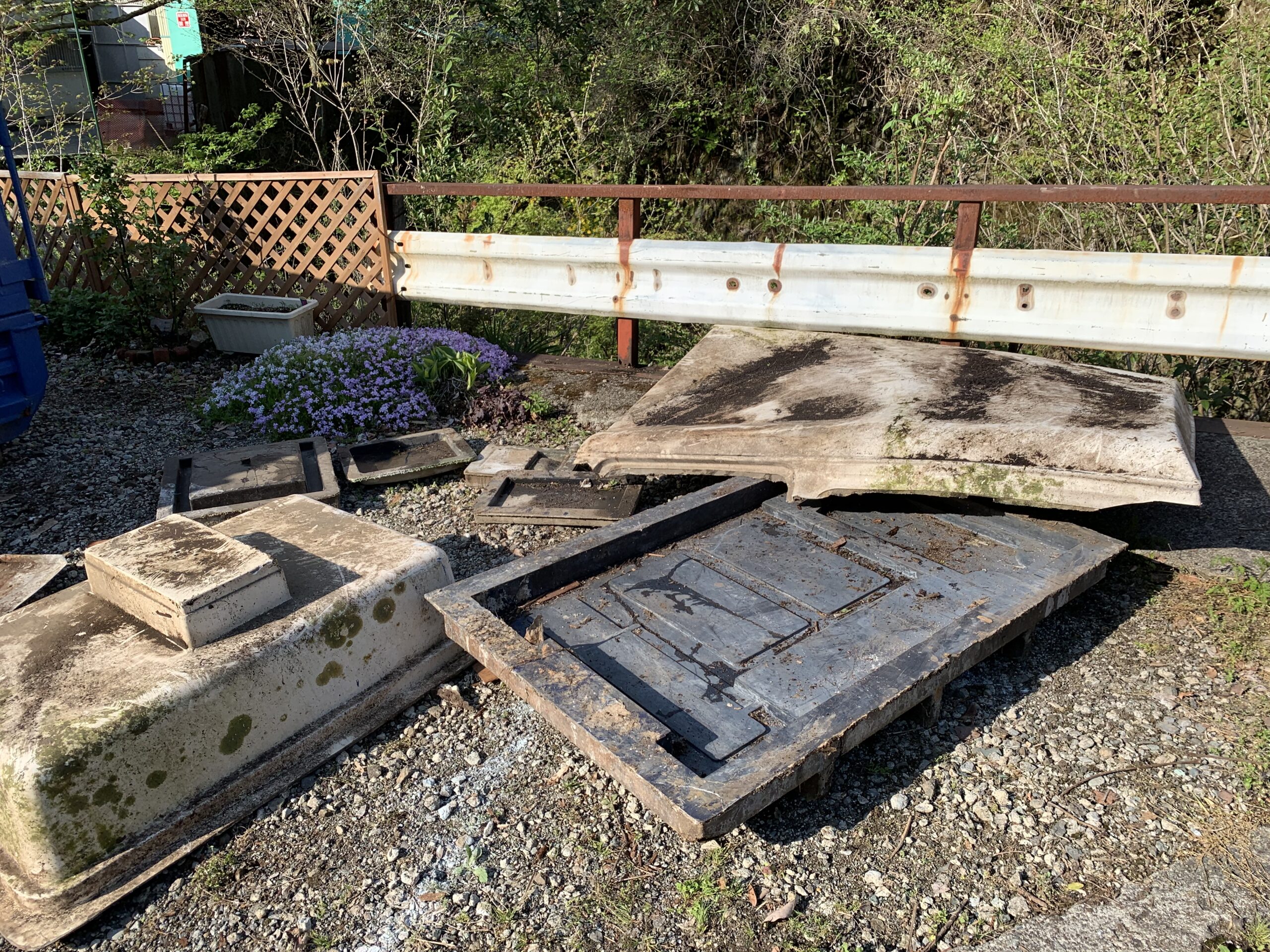 50年間暴露したGFRP成形体の評価について - 株式会社FRPカジ 本社工場周辺を片付けている際に前身のFRP製造会社が50年前に製造したゴルフ場用カートの天井部や住宅関係、鉄道関係のFRP製品を製作するための生産型等が曝露状態であった...