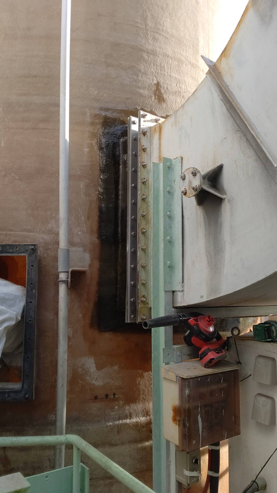 某メッキ工場様からの技術相談により、脱ガス塔(スクラバー)ガス入口角フランジ(1300㍉✕1100㍉)の接合部より漏れが発生しているお話しをいただき、