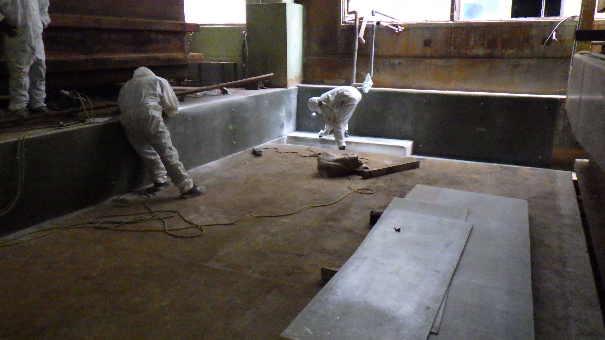 某溶融メッキ工場からの技術相談により、FRP角槽(6500×1500×1800Hmm)が複数設置のピット内が30年近く薬品により徐々に劣化して、コンクリート面に施してあったFRPライニング部は腐食していました。